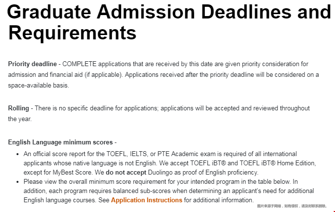 2)研究生语言要求:因不同的研究生项目语言要求不同,一般托福不低于80分,雅思不低于6.5分。下面是罗彻斯特理工学院各个研究生项目的托福和雅思最低分数要求列表: