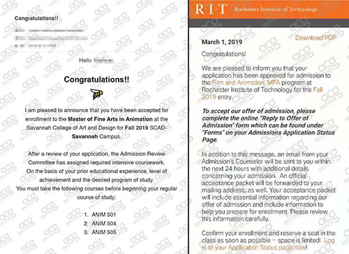 刘同学:可能是缘分吧。还是看重咱们这边的经验,因为虽然是申请美国,但是不同院校的一些细微的要求啊,还有就是作品集整体风格的把握这些,咱们都是很专业的,而且专业老师也非常负责,告诉我大的方向,避免我自己走入坑中。