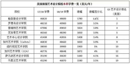 艺术专业学院学费大约在40000-50000美元左右,如帕斯森艺术学院学费是48600美元;罗德岛艺术学院学费是49900美元。