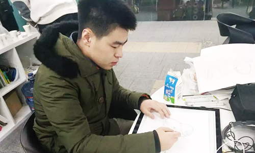 A:去年八月份开始想学艺术。原来一直想学机械方面的,因为我特别喜欢汽车飞机方面,后来发现自己更喜欢设计一些东西,设计它的外观、造型、所以我觉得更适合产品设计这个专业。原来上课的时候也喜欢偷偷的在书上画些飞机啊,汽车啊什么的。自己没有学过画画,就是照着汽车杂志上临摹。