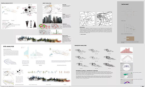 作品的版式原则是清晰有条理并且具观赏性。并不是图越多,版面撑地越满越好。将想要表达的设计重点(轴测、剖透视、优秀的平面、综合分析图等)放大表达,其他辅助性分析图表按照重要程度缩小排整齐即可。