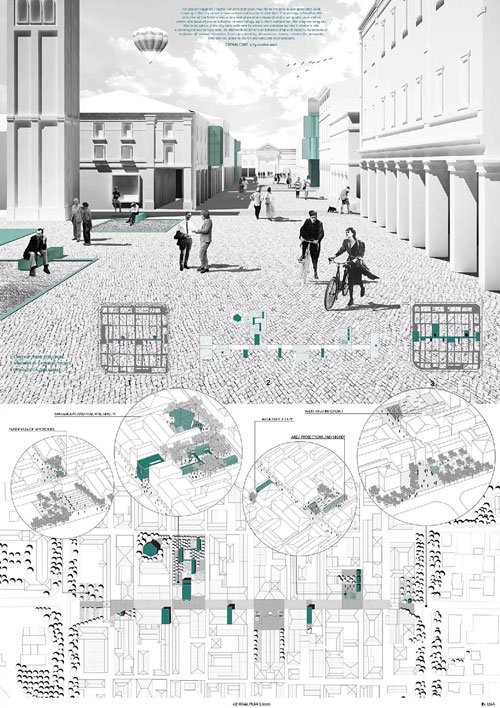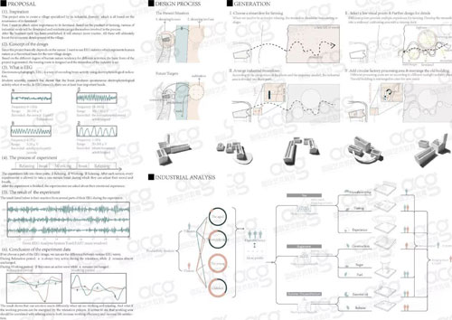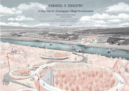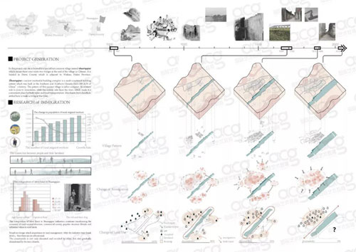 这两张是一个农业与工业结合村落改造的项目,根据项目研究课题复兴荒村而做的前期调研。从村里演变史开始进行研究,找出村落衰败的原因,基于这个原因而确定的设计理念是从河对岸的生态农业开始,激活生态农业产业,利用水陆的运输效应所带来的部分经济利益,从而带动本村的新型的集生产、加工、旅游一体的复兴模式。她做的是一个产业模式的研究,以荒村为模型去研究,这样的模式是可以复制到其他村落里面去的。