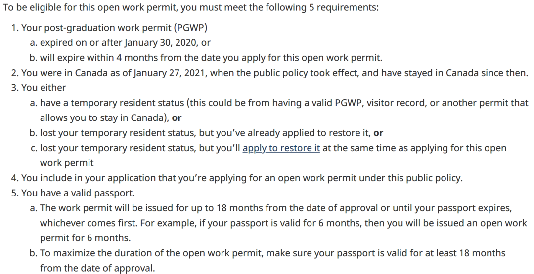 申请人需要同时满足上述5个要求才能申请PGWP延期。根据第一点可知道,签证有效期在特定时间内的人可以申请,同时,根据公告,针对此次延期的申请,开放时间为1月27日至7月27日,必须在此时间内申请才会获批延期。后续是否还会延期开放申请时间,还需观望。