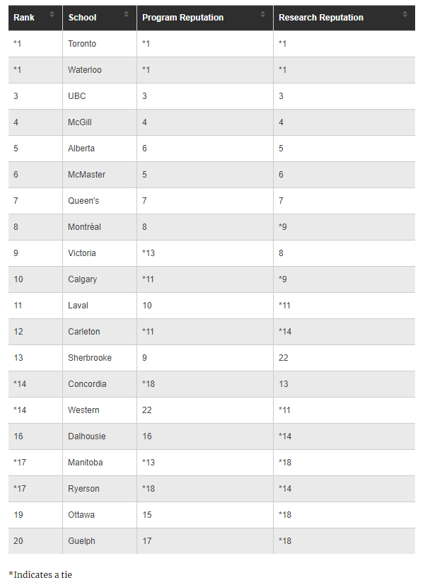 在此次排名中,UBC大学、多伦多大学和滑铁卢大学并列第1位,麦吉尔大学排在第4位,阿尔伯塔大学第5位。