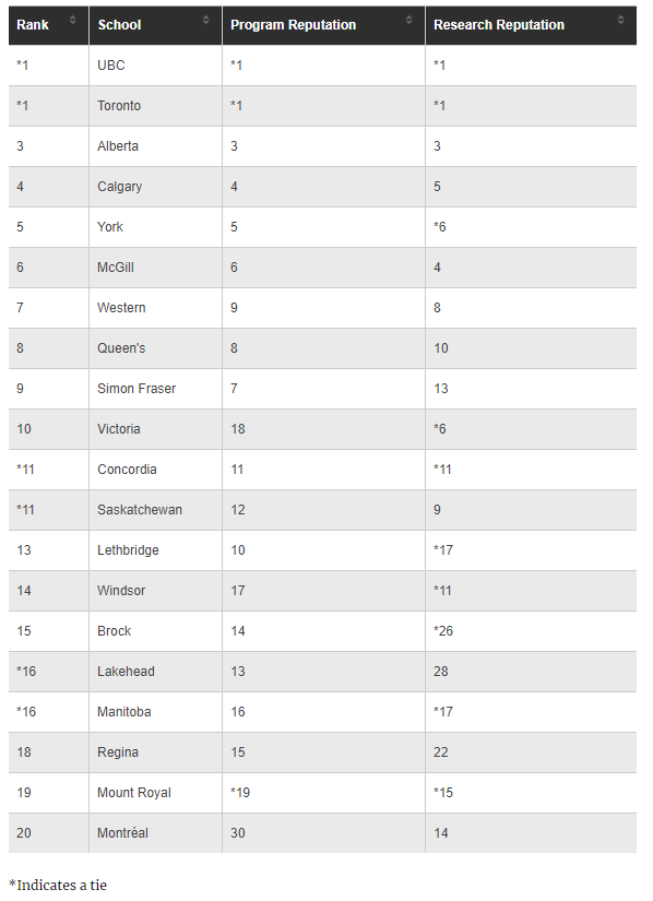 在此次排名中,UBC、麦吉尔大学和多伦多大学并列第1位。阿尔伯塔大学和西安大略大学排在第4位,约克大学教育并列第6位。