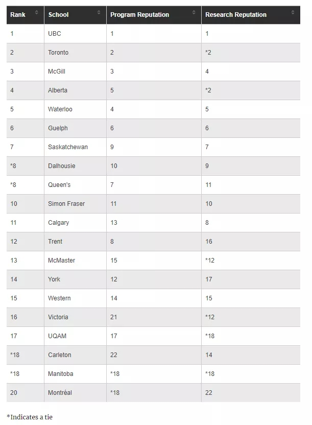 此次排名中,多伦多大学位列榜首,阿尔伯塔大学和UBC大学并列第2位,麦克麦马斯特在第4位。