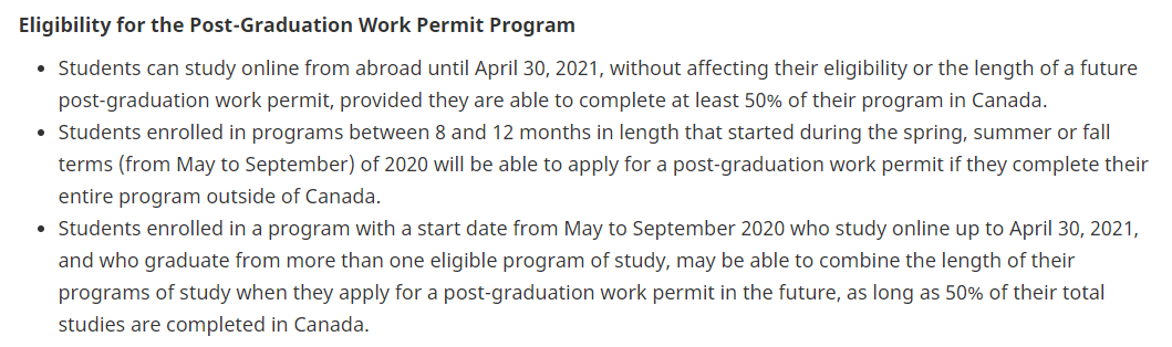 一,为了帮助更多在加拿大境外上网课的同学能在毕业后取得加拿大毕业工签,移民局对毕业工签的申请要求作出了下述三项调整: