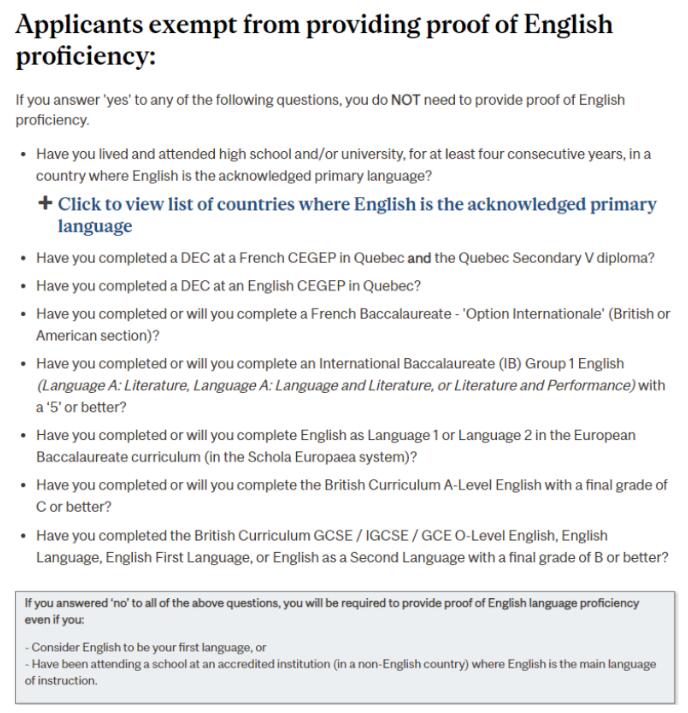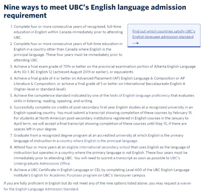 UBC官网列出了9种满足其入学语言要求的方式。UBC和多大一样,支持上述所说的在加拿大念4年高中免语言测试。