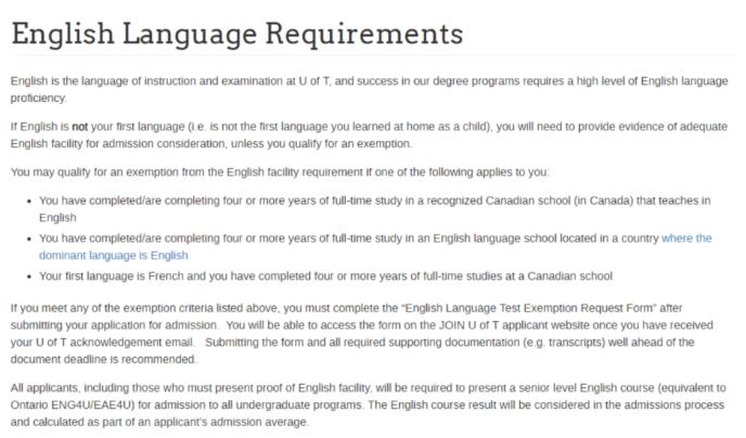 多伦多大学是支持我们上述所说的念4年加拿大中学即可免语言测试的!只要提交高中时的英语平时成绩即可。不过多大要求在申请的同时,向多大提供一份豁免语言申请表。