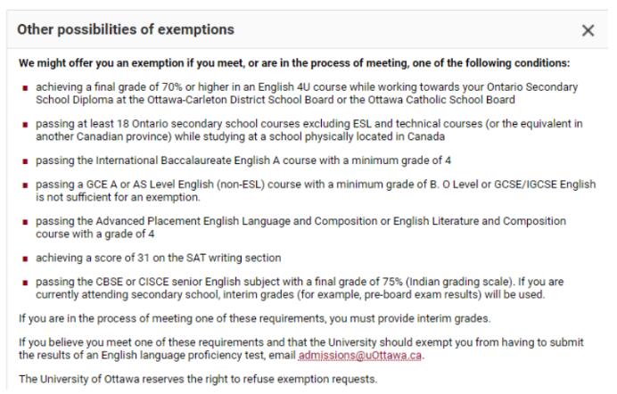 另外,针对一些主流的国际学制/标化测试,渥太华大学接受IB English A 4分以上,或者A2/AS English B以上(IGSCE不满足),AP English 4分以上,SAT写作31分以上等等条件。但是具体能够豁免与否,还是学校最终说了算。