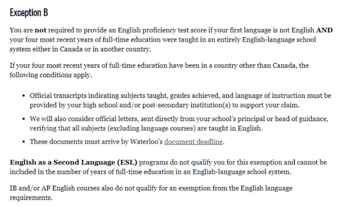 和之前谈到的几所大学不同的是,滑铁卢大学既不承认IB/AP等课程,也不承认ESL作为豁免标化英语的条件!