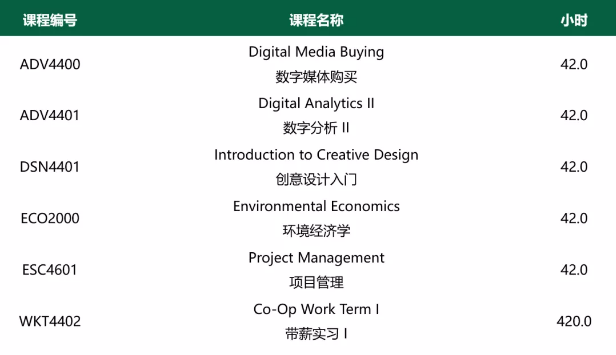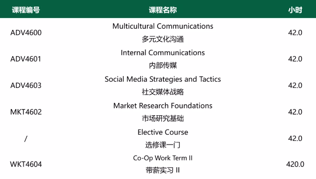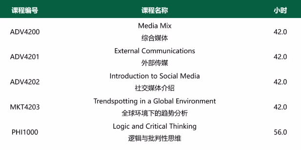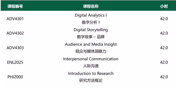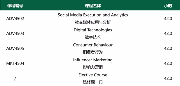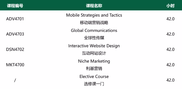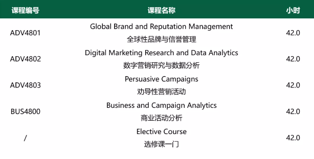 学生将学习媒体渠道选择、数字叙事、营销传播研究、数字分析和全球传播等方面的理论和实践知识。通过案例研究和实践环节,为学生提供了在现实环境中实践所学知识的机会。此外,学生还会进行市场调研,利用数字分析和市场调研来做出决策,并在课堂上为客户制定传媒推广计划。