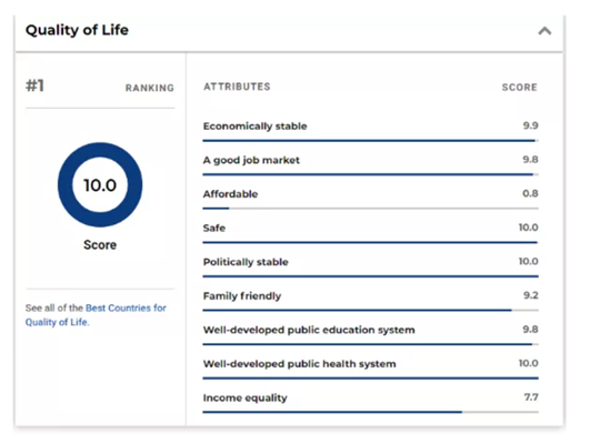 加拿大经济稳定、政治稳定性、教育和医疗健康系统等方面都接近满分。成为全球最宜居国家,生活质量第一也不意外。