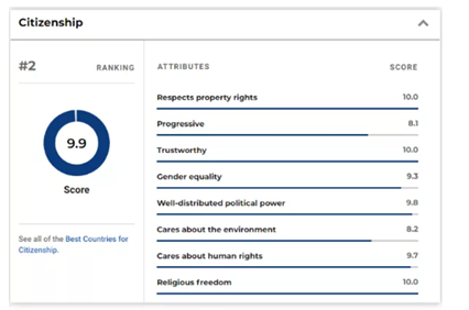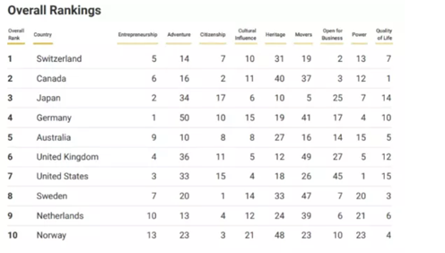 “全球最佳国家”指数排名是由美国新闻与世界报道(USnews)以及美国的宾夕法尼亚大学沃顿商学院合作推出的。