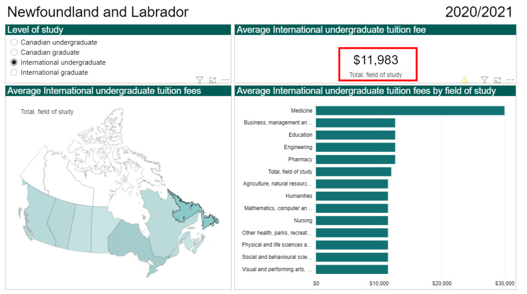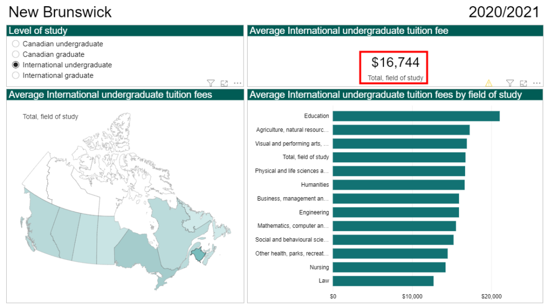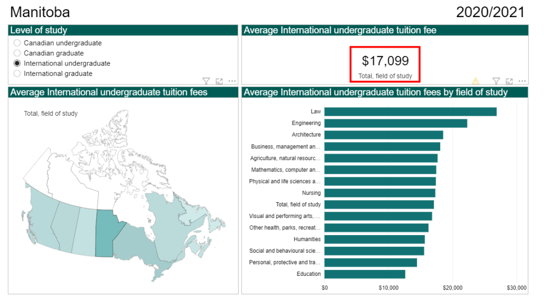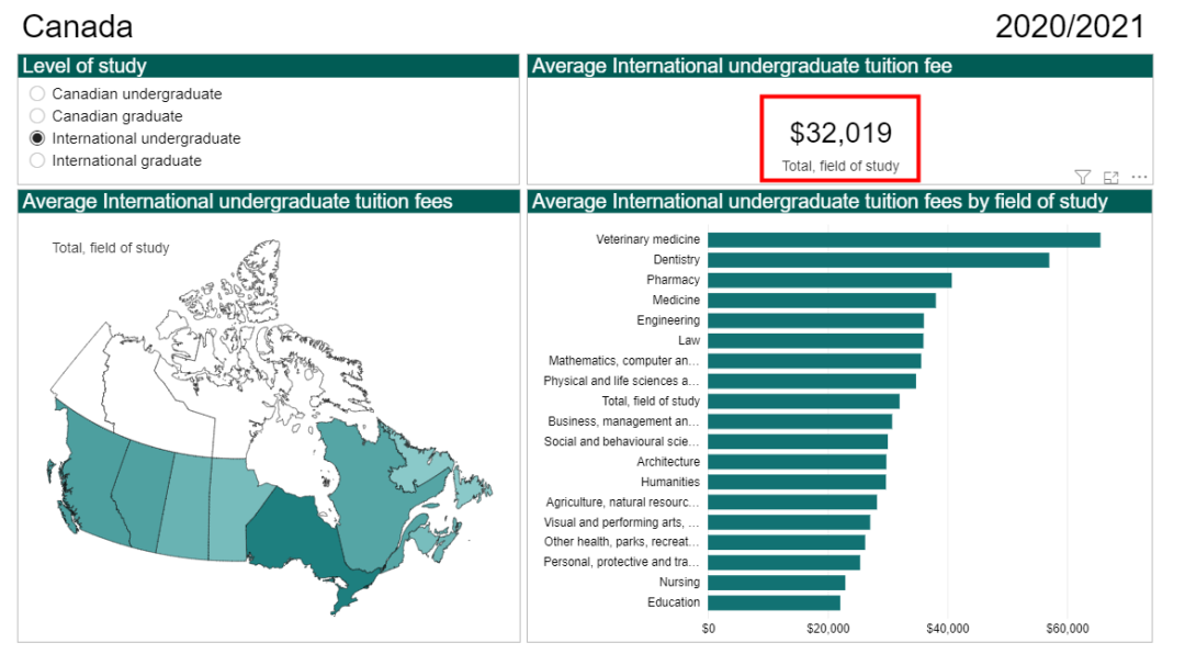 以下是加拿大全国各省和地区的本科/研究生留学生2020/2021的平均学费报告:
