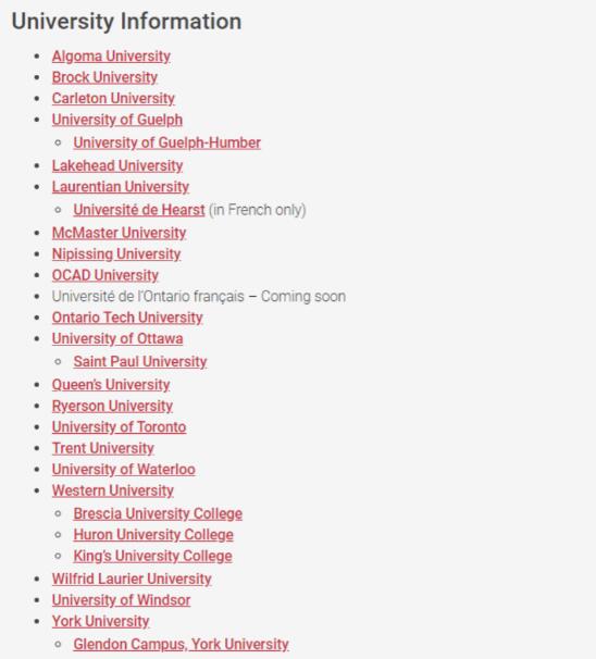 首先,我们先来简单介绍一下OUAC这个神奇的系统~(OUAC链接:https://www.ouac.on.ca/)可通过此系统申请的院校共有21所,名单如下: