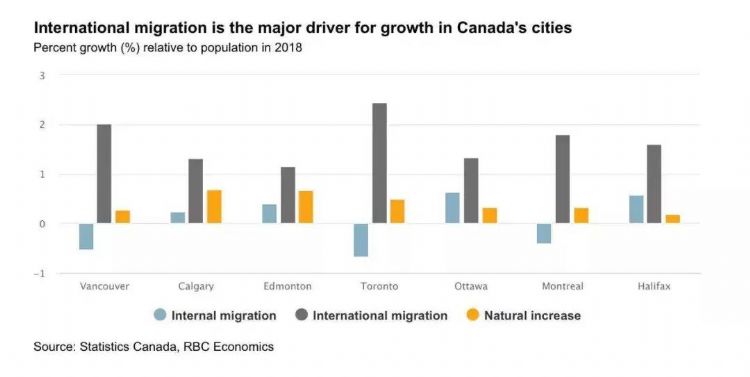 以以以下七个加拿大城市的人口增长为例,每个地方人口增长最多的城市都来自国际移民。然而,温哥华、多伦多和蒙特利尔甚至出现了国际移民激增和当地人口负增长。