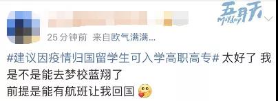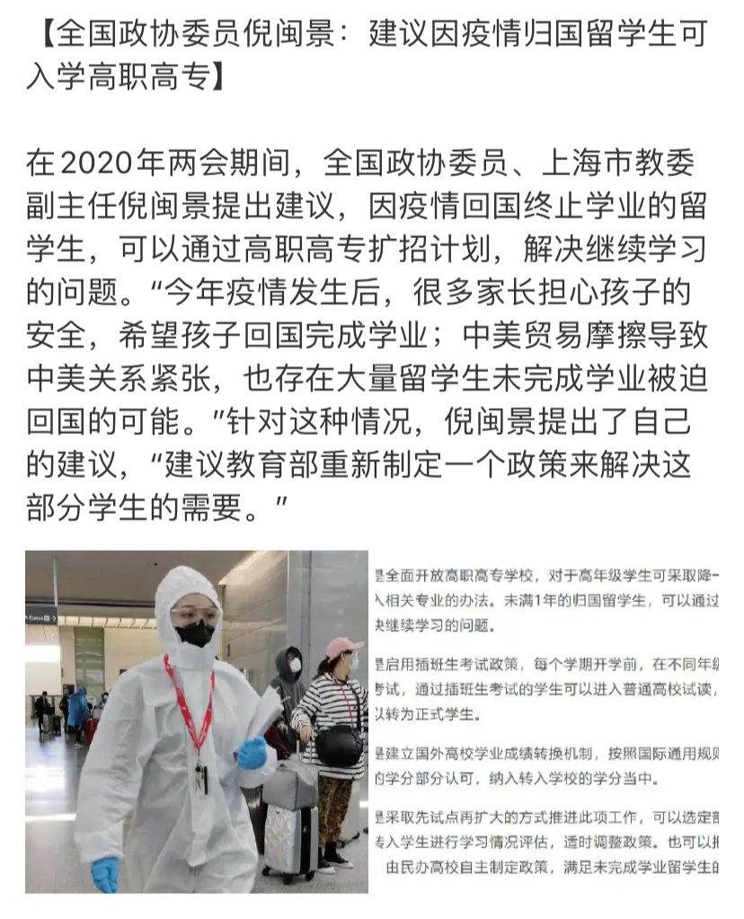 原来一个政协委员提出了这么一条建议:因疫情回国终止学业的留学生,可以通过高职高专扩招计划,解决继续学习的问题。