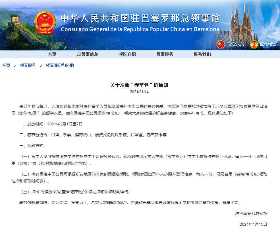 中国驻巴塞罗那总领馆将为西班牙加区的留学生、确有困难中国公民提供春节包组合,包括口罩、手套、消毒纸巾、便携式免洗洗手液、口罩盒、春节贺卡等。