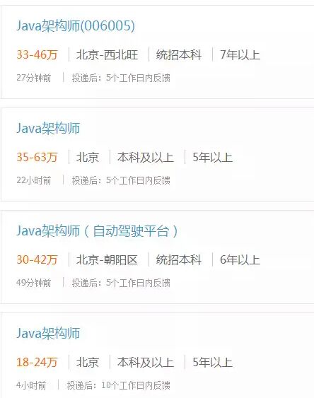 某职业网站最新数据统计显示:北京地区Java架构师平均月薪42100元,年薪30万-50万架构师占比最多,达39%。经验要求,3-5年工作经验要求的占比最多,达48%;学历要求,本科学历要求的占比最多,达87%。该数据仅供参考