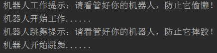 System.out.println("机器人工作提示:请看管好的你机器人,防止它偷懒!");