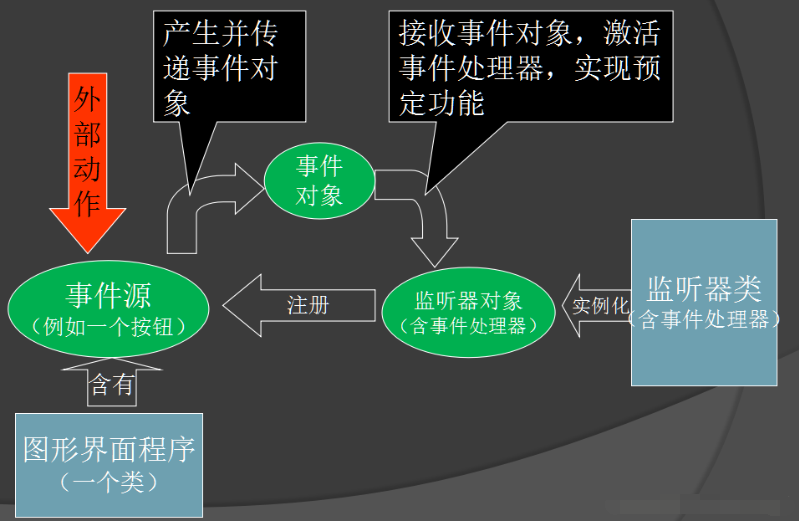 (1)事件:用户对组件的一个操作,或者说程序执行某个方法,称之为一个事件,如机器人程序执行工作。