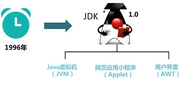 1996年可以说是Java语言里程碑的一年,在这一年,我们Java程序员熟悉的JDK 1.0开始8发布了,Java语言有了第一个正式版本的运行环境。JDK 1.0中包括了Java虚拟机、网页应用小程序,等各种可以嵌套在网页中运行,用户界面组件,通过用户界面组件开发窗口的应用程序。