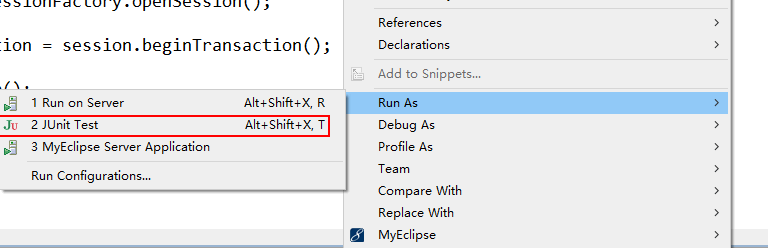 在 UserTest 类中,右击 testInsert() 方法,在弹出的快捷菜单中选择 Run As→JUnit Test 选项运行测试,如图所示。