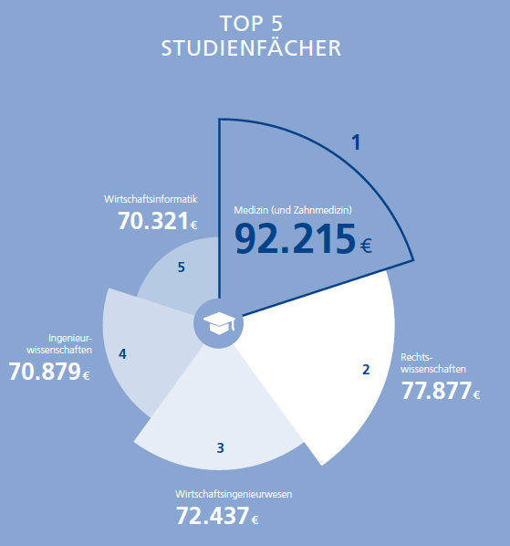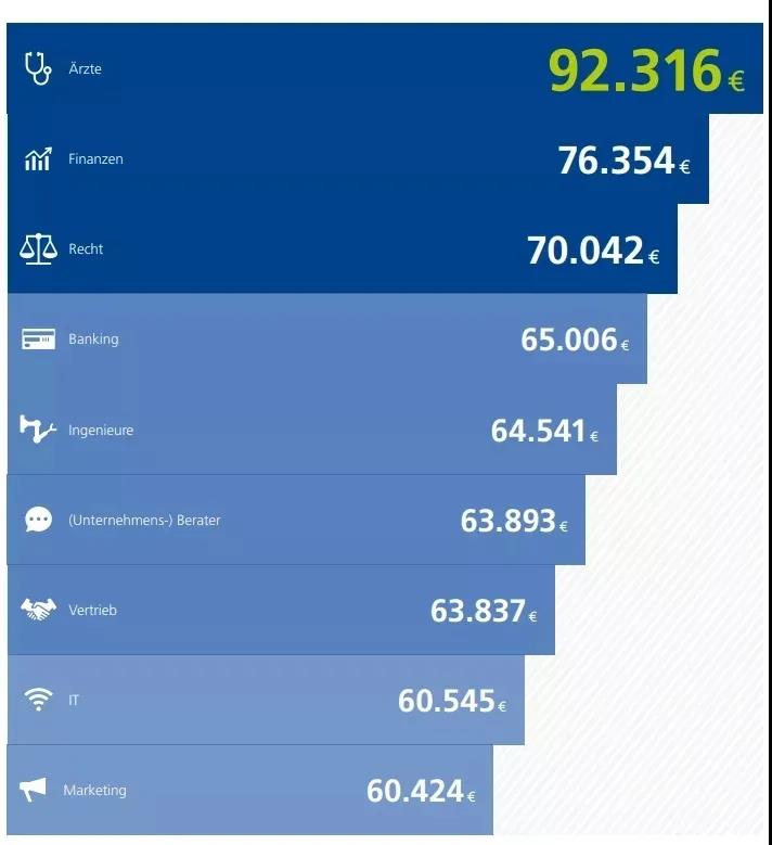 位居第一的是医学专业,据说德国学医的都是学霸,因为德国医学专业要求的Abitur分数很高,一群学霸所学的专业工资肯定低不了。