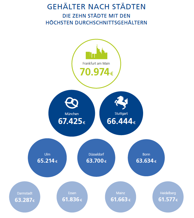 在所有统计的城市中,法兰克福的均薪高达70974欧/年位居第一,慕尼黑排第二均薪为67425欧/年,斯图加特排第三均薪66444欧/年。