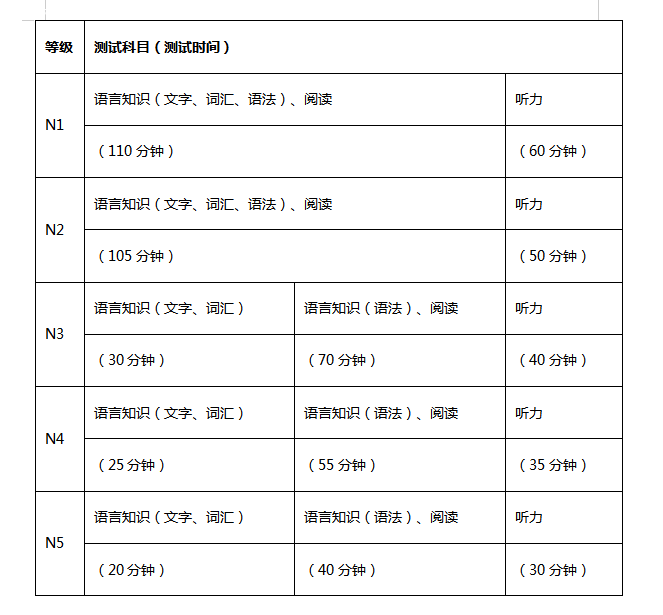N1与N2设有“语言知识(文字、词汇、语法)、阅读”与“听力” 2个科目。