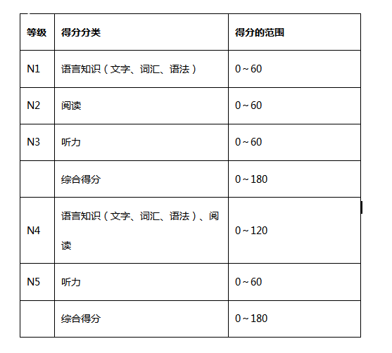 N1、N2考试分“语言知识(文字、词汇、语法)、阅读”和“听力”2个科目,N3、N4、N5考试分“语言知识(文字、词汇)”;“语言知识(语法)、阅读”及“听力”3个科目,满分均为180分。成绩通知书由国际交流基金会通过教育部考试中心及下设考点发放给考生本人,成绩合格者还将同时得到日本国际交流基金会颁发的合格证书。N1、N2、N3、N4、N5级的合格证书均长期有效。