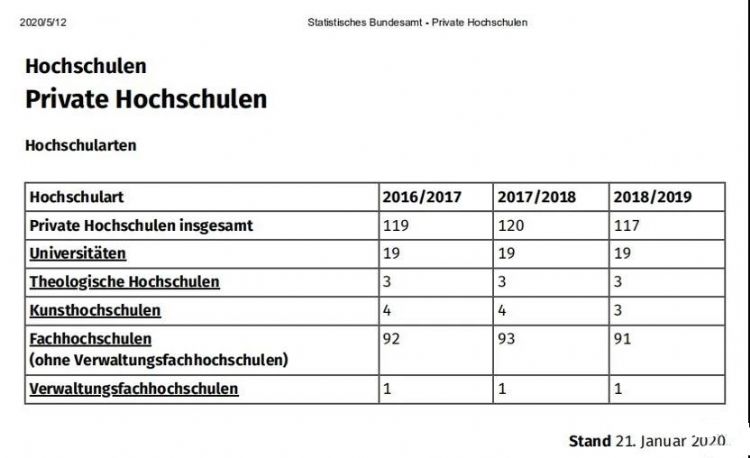 在联邦数据局的统计中可以看出,在2018/2019学年,德国共有117所私立高校,此中有19所综合性大学、91所运用科技大学和3所艺术音乐院校。其他尚有3所私立的神学院和一所行政学院。