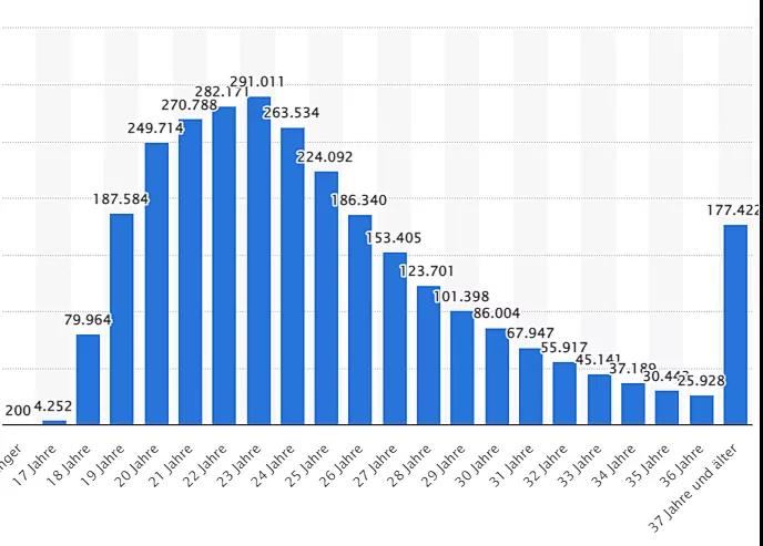 从民间数据可知,德国大学2020/2021冬季学期注册学生人数约为290万,学生岁数散布纠合在19-26岁,最多的是23岁,有29万余名。但是,30岁及以上的学生占比也的确良多。