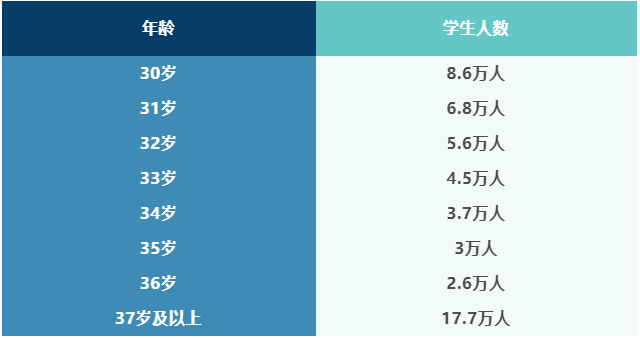 可以看到,德国30岁及以上的在读大学子约有55.5万名,占大学学生总人数19.1%!37岁及以上的有了17.7万人。