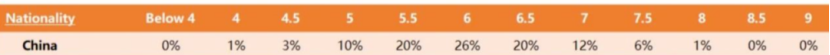 在A类考试单项中,听力均分:6.1,阅读均分:6.4;写作和口语仍旧是中国考生们的弱势,均分分别为:5.8(写作)、5.6(口语)。口语排名倒数第二,和排名垫底的日本考生相差0.1。