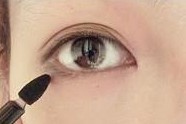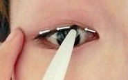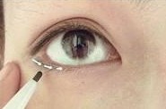 步骤2:用手将上眼皮轻轻的提起来,然后用黑色眼线笔沿着睫毛根部画内眼线,眼尾处可稍微拉长,根据眼型的水平线平拉下来。