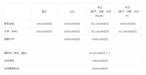 日本学校的学费没有美国和英国的大学贵。此外,有些学校采用了免除或减免学费的制度,请在制定资金计划时参考。第一年需要缴纳的入学费和学费的平均金额如下所示。此外,也有需要支付考试费、教材和实习费等的情况。入学费、学费等各学校有所不同。此外,根据居住地的不同,学费也有可能不同,请事先在志愿报考学校的主页、招生简章等上确认。