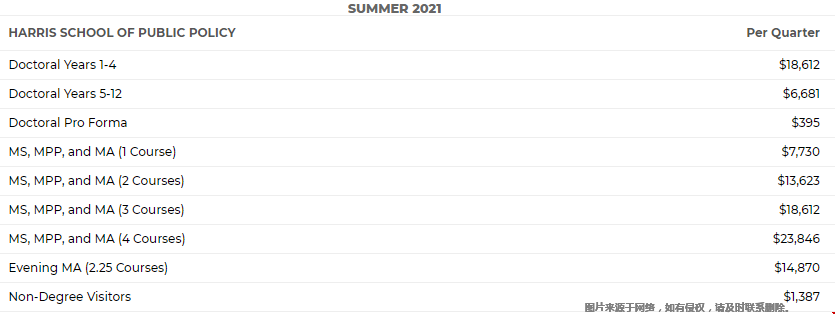 芝加哥大学哈里斯公共政策学院学费,官网预计每年会增加3%至5%,对于硕士生,学费是根据每季度上课的次数计算的。全日制学生每学期选修三门课程。夜间硕士课程的学生每学期选修2.25门课程,对于博士生,学费基于居住年份。学生需按自己的实际情况做出费用调整。