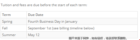 学杂费应在每学期开始前,即1月和8月初到期,学生最好在以下截止日期前递交。