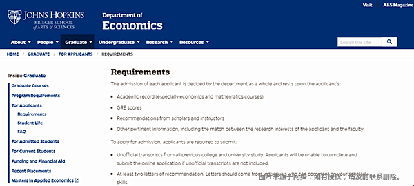 一)下面是约翰霍普金斯大学经济学硕士录取官网要求:学术成绩、推荐信、GRE分数和匹配度等作为申请要求。