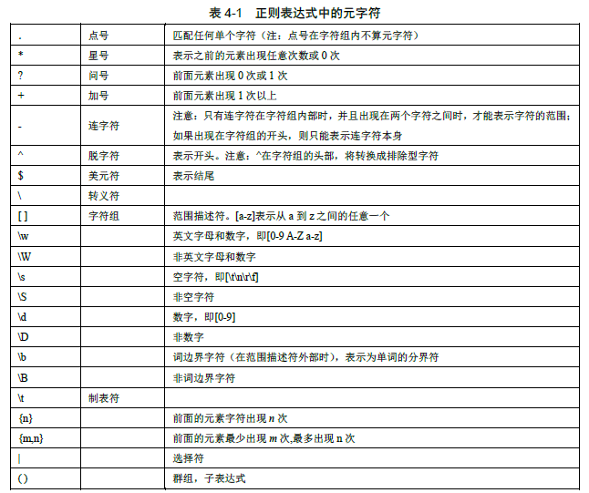 本实例使用正则表达式对电话号码进行了格式匹配验证。正则表达式通常被用于判断语句中,来检查某一字符串是否满足某一格式。它是含有一些特殊意义字符的字符串,这些特殊字符称为正则表达式的元字符。正则表达式中的元字符及其意义如表4-1 所示。