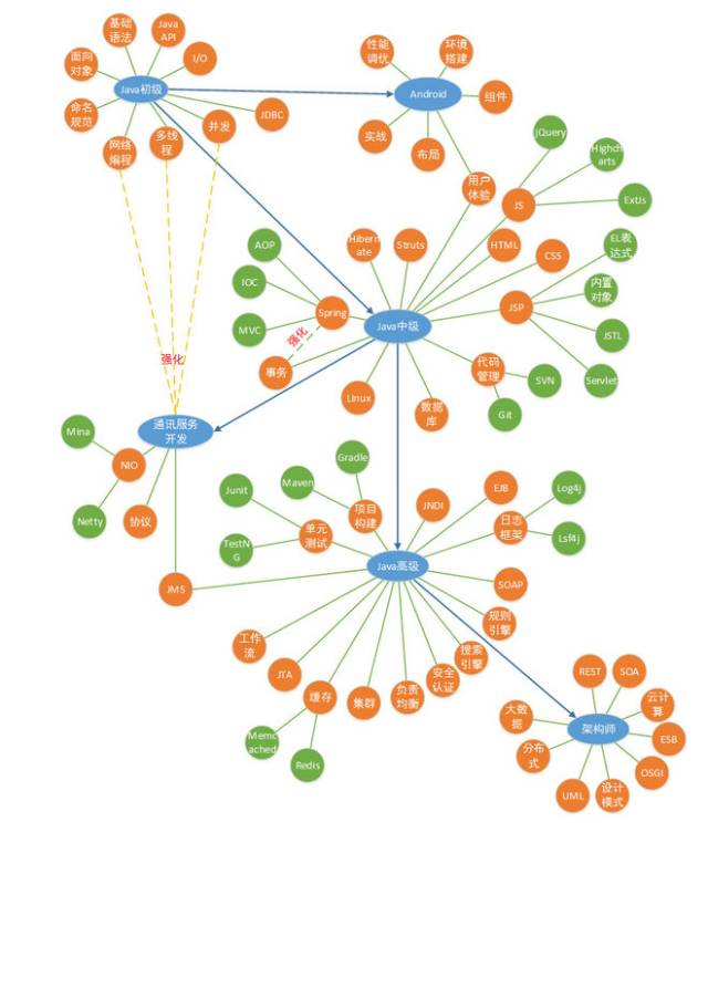 Java程序员可以有三个进阶方向,分别是Android 移动端开发(以下简称Android)、Web 开发(以下简称Web)和通讯开发。这时目前主流的三大方向。其中最多的是Android和Web。下面分别介绍这三个方向。以下三个方向都需要有扎实的Java基础。