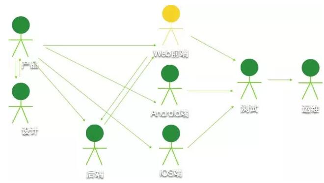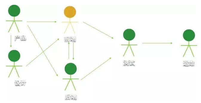 在一个典型的互联网公司的产品研发流程中,前端工程师和其他角色的关系大致上是这样的: