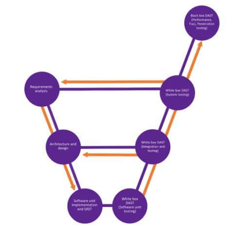 这里描述的所有与安全相关的工具、测试和技术在每个生命周期模型中都有一席之地。在V模型中,它们在很大程度上类似于通常与功能安全应用程序开发相关联的过程,并对其进行补充(图1)。
