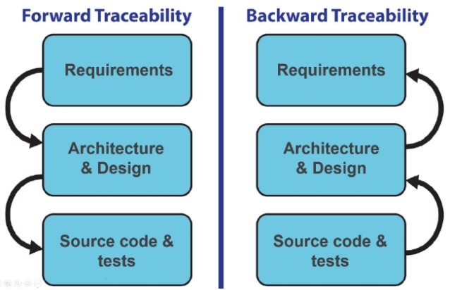 软件工程术语的IEEE标准词汇表将可追溯性定义为“在开发过程的两个或更多产品之间建立关系的程度,尤其是相互之间具有前任-继任者或主从关系的产品。”双向可追溯性意味着可追溯性路径被向前和向后维护(图3)。