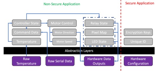 在嵌入式开发中对于具有需要从安全角度保护的数据资产的系统,首先的分解步骤之一是将体系结构进一步分为安全和非安全的体系结构部分。例如,如果我分解我们已经检查过的电机控制器设备,架构图可能如图4所示。这是因为该图根据数据资产应该位于的安全域来分隔数据资产。(威胁模型和安全分析可以识别这些资产。)