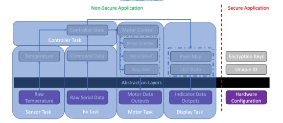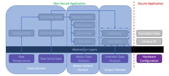 有趣的是,当以这种方式看待领域时,它们通常跨越应用程序层,包含与领域相关的所有内容。例如,电机控制域管理高级应用程序状态,并通过抽象层与低级硬件交互。甚至可能需要一个应用程序接口,以便域之间进行交互,正如在输入和电机控制域之间可以看到的那样。使用RTOS为各个域创建消息队列以便彼此交互并不罕见。